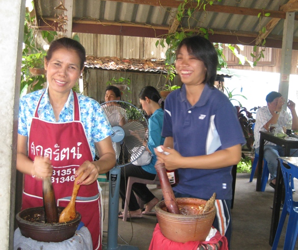 One thing any Thai in Isaan knows is where to get the best Som Tam. If there is one particular food that they eat here it is Som Tam. It’s main ingredient is green (we westerners would say unripe – but what do we know?) shredded papayas. Some other ingredients I can remember are prik ki nu (the peppers that can make it very spicy/hot), peanuts, maybe some long beans, a couple of small tomatoes, a few lime halves with the peel thrown in after squeezing, a few garlic cloves, dried shrimp and fish sauce. They often put in bpara which is some kind of fermented mudfish. My daughter in law who is currently in the U.S. translates that to “smelly fish” because if she ever cooks any it has to be outside, since my son can’t stand the smell. I can’t either, for that matter. Finally they throw in a spoonful of sugar and a spoonful of MSG.