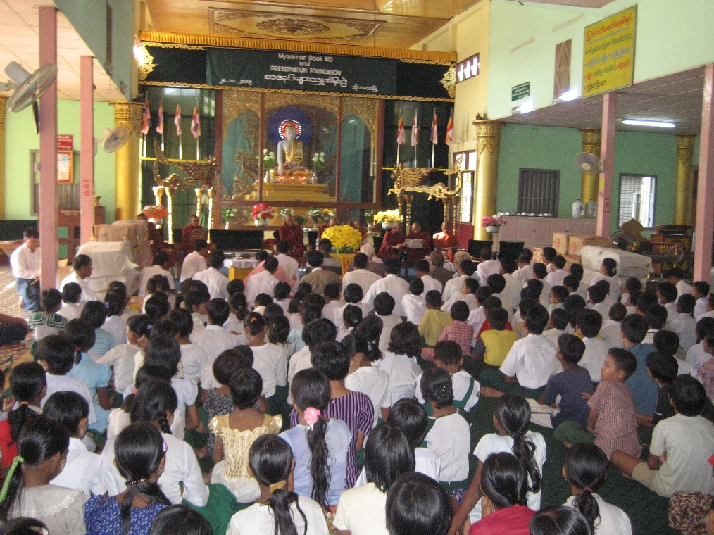 Things are done in the Buddhist way, with appropriate ceremony. Several of these presentations have occurred in the past in various parts of Myanmar but this is the first that I have attended. The monks are in front, the adults facing them in the audience, and the children from the temple school are behind. The banner of Myanmar Book Aid and Preservation Foundation, our counterpart organization in Myanmar, is over the front area. The boxes on either side between the monks and the audience hold our books. The brown boxes are primarily English language children’s books while the white boxes are Burmese language books purchased from the proceeds of selling some of the popular fiction and non fiction books we bring over at book fairs in Yangon.
