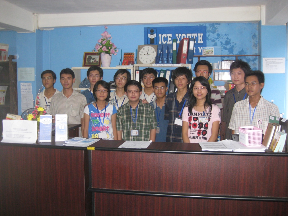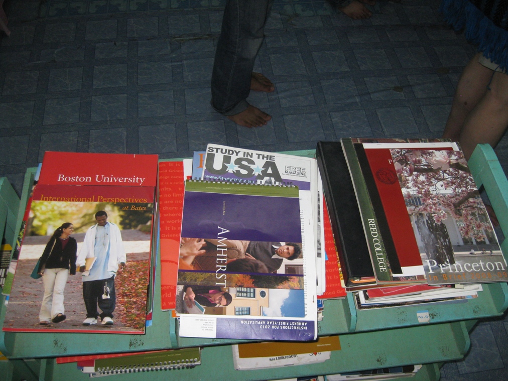 So who else did we meet? One place that receives books and help from us is the ICE-Youth (Information Center for Every Youth) library in Yangon (see video). This has been running since 2002 and is staffed completely by volunteer students. It has both English and Burmese language books. The photo shows the library staff. At any given time normally only three or four of them would be on duty. What kind of students volunteer to run a library? Each year a test similar to our SAT test is given to 300,000 graduating students in Myanmar. Meeting us there were the students who placed first, second and fourth in this test. I took the third photo on the right showing the top top of a small cart near the front desk. It shows what many of these students and others who come into this library are thinking about.