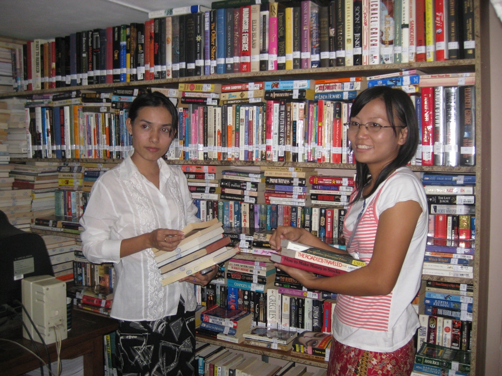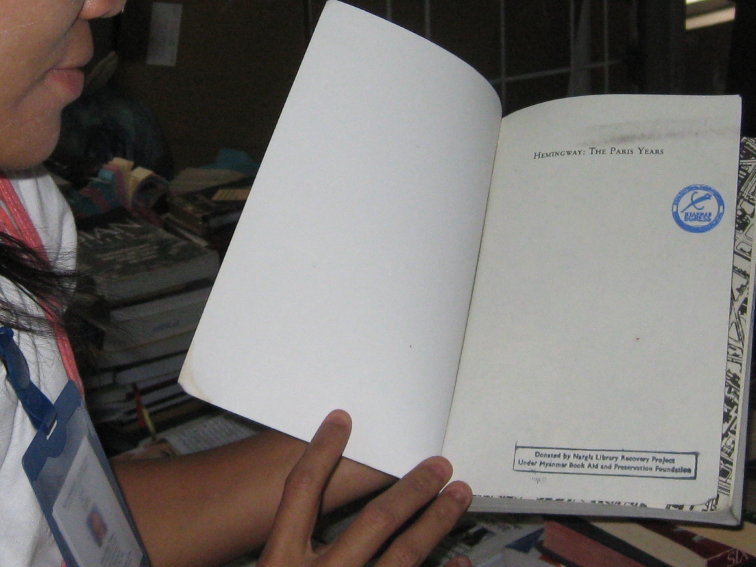Myanmar Egress is an association which teaches as well as coordinates activities of students and graduates in Yangon. Students in the class pictured are studying international economics. Immediately after cyclone Nargis aid was delayed in getting to the victims. This is the organization that first got aid to the south, and then quickly trained other NGO’s how to operate in the south and cooperate with the Myanmar government. Their English language library is important to them. The librarians pulled a number of books off the shelves, and there on the inside cover was our stamp.