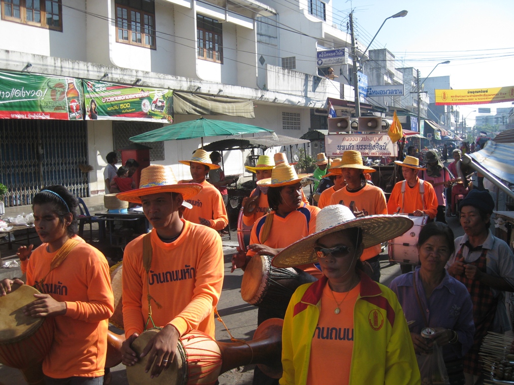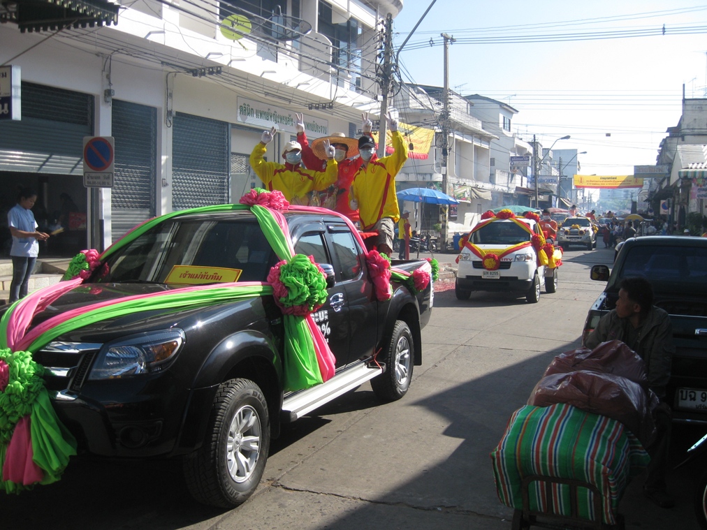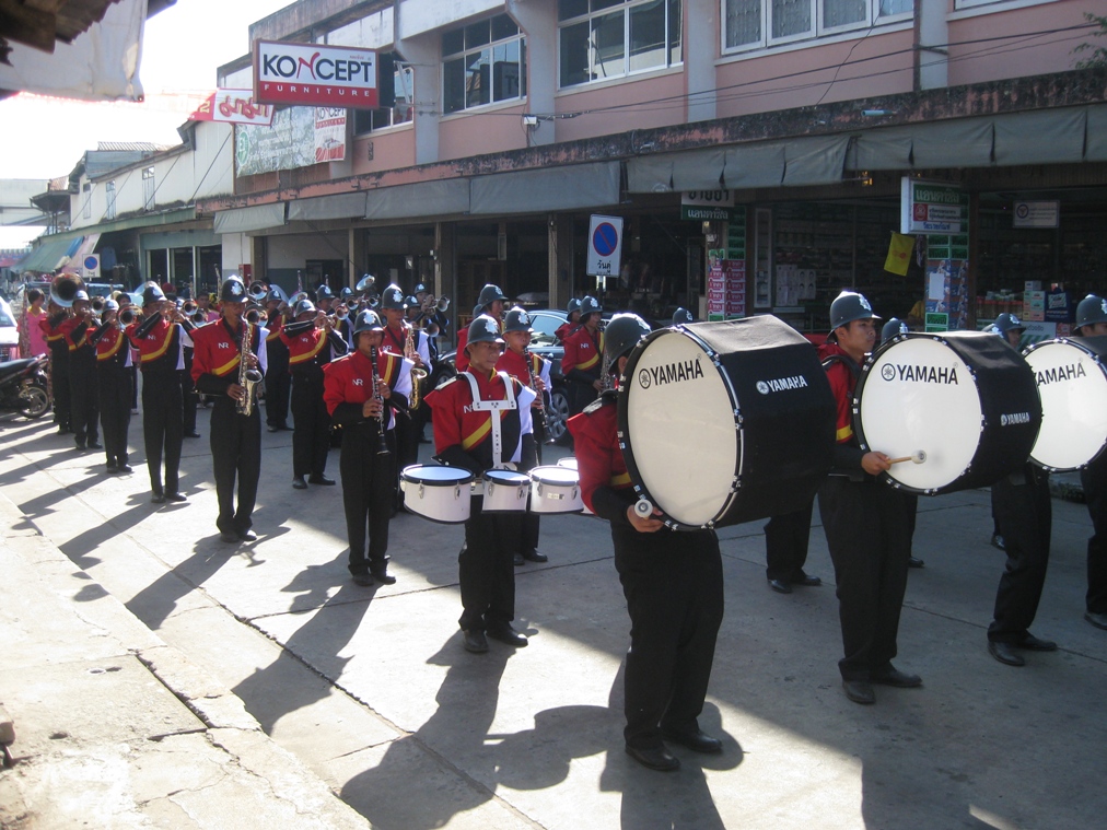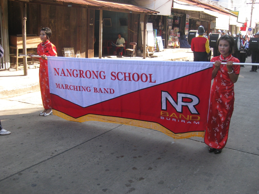 I woke up a bit late yesterday to the sound of a marching band outside. They have a lot of celebrations in Nang Rong. I probably miss most of them since I am not always here. Anyway, I got out quickly and there they were a block away. I’m still not exactly sure what is was all about. The Banners across the street say “Father God of Nang Rong”. Apparently it was Chinese Thai specific celebration connected with the coming Chinese new year that emphasizes honoring of God (I’m not sure which one) and ancestors.