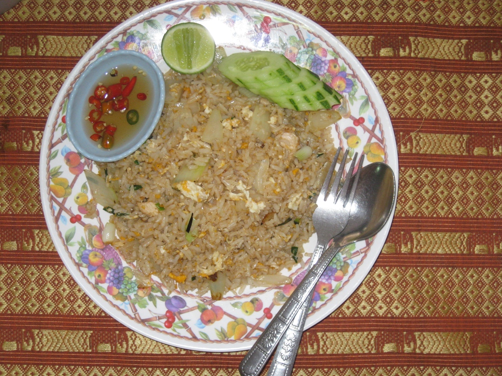 After having sworn off, I tried it again a few weeks ago when working at the foundation office. We all ordered kao pat gai from Nong Biea to be brought in for lunch. It looked and tasted a bit lighter than I remembered, so a few days ago I did the “test” again. I got both a take out and an eat in order of kao pat gai. It was very good at the restaurant, and when I took it out of the refrigerator the next day it still looked good, without any more clumping up than already cooked rice is going to do. After microwaving it tasted pretty much the same as the day before.