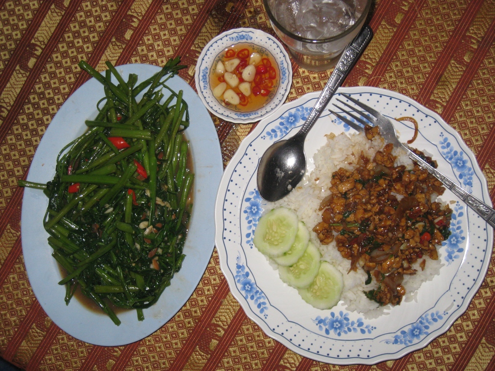 Kao pat gai is normally not spicy at all. You can add the red peppers shown in the small dish if you wish. I usually do. At Nong Biea I also like gapow gai, a spicier dish with chicken and steamed rice in the rightmost picture. Pak boong, the green vegetable shown with it, is a very common vegetable and is maybe the Thai substitute for spinach.