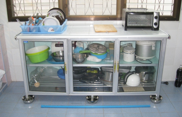 All I needed to do was ask a Thai. I bought six small bowls for the six legs on my cheap aluminum kitchen cabinet. The legs sit in the bowls which are filled with water. The fifty cent blue pipe is needed to fill the back center bowl. It should take more than a month for the water to evaporate, and we can move everything into the refrigerator when we leave for the U.S.
