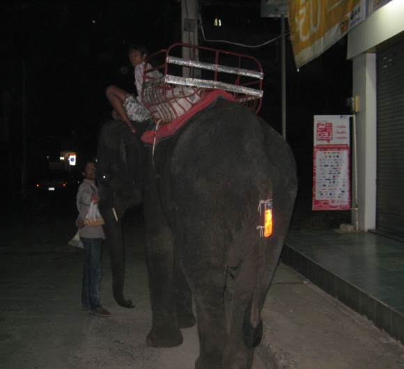 The first picture was taken at night just as I left my landlord’s house. This elephant goes around Nang Rong in the evening with a reflector tied to his tail, stopping at the restaurants. Since the restaurants are open to the outside, the elephant just comes up close, but not close enough to grab anything off your table or tap you on the shoulder with his trunk. If it is dark outside you don’t notice him until he’s there. His handler sells a bag of sugar cane you can buy and feed back to him. My wife always goes for it.