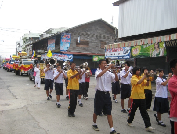 The final thing to report is that I ran into another parade two days ago, on the street that crosses my street five houses down. The flatbed trucks you see coming held monks and nuns sitting in rows. Something to do with buddhism, of course, but other than that I don’t know. Now just about every street around me has had a parade in the last year except mine. Some weddings, a few ordinations (kids becoming a monk for awhile) and buddhist house warming celebrations, but no real parades.