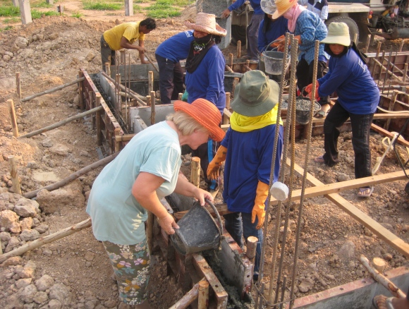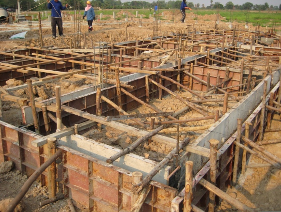 The forms were completed, rebar inspected and we started pouring foundation concrete the same day we were planting the first large trees. Sue was helping out in both areas, although she spent a lot more time on the tree project. Landscaping and gardening are things she really likes. The second picture gives a better overview of the low beams which will support the driveway to the side of the house. The higher beams for the house itself have not been formed up yet.