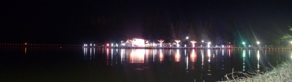 There is a long straight wide street in front of the reservoir with restaurants on the other side. This night there were a great many food carts and sellers along that side also. Several parades, each complete with sound carts (see my article on that) came by during the time we were there. My camera is not made for it, but I caught a small section of one parade with local ladies dancing. A lot of tents, a performance stage and other things were on the peninsula out into the lake. We did not get out there but I show a picture of it from across the lake.