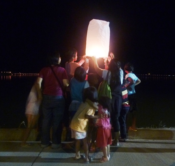 Holding the khom loi while its air heats up. Our fearless leader Walai to the left in the purple shirt. Right with the green purse is our bookkeeper and launch manager Pisamai. Our current youngest and third youngest girls stand in front of picture. You can see candles placed on the rail all around the reservoir in the background.