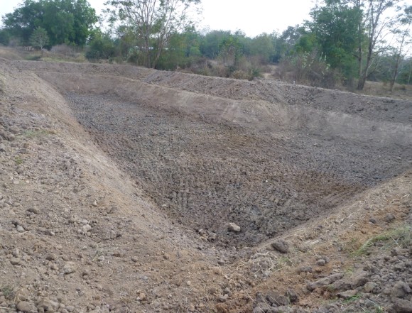 We are digging a pond and using the dirt from it to build up areas on either side of the road where we are building our first houses. Eventually, of course, we will be bringing in a lot more fill dirt from the outside, since we still have to bring up more than half of our property by a meter and a half at some point. What we have already filled gives us room for our first sixteen houses, our main office/rest home/dormitory/school building and the volunteer apartments we hope to build someday.