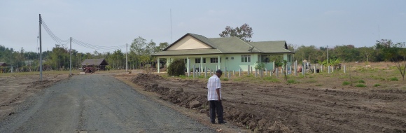 It is probably awhile before we need to bring in more dirt from the outside, so digging the pond lets us raise fish as well as get rid of a couple of areas that can get marshy after the big rains. We’ll raise the same fish that we see for sale at the markets here. They seem to be the most popular with Nang Rong people and are not as cheap to buy as I would have expected. After I took the picture of the future pond, which is just to the outside of the circle road, I turned around and got our house with the pilings for the next house showing to its side. We will be building on these very soon.