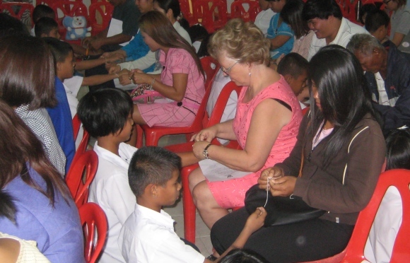 At one point the students all came and kneeled before their mother or father to show respect and had a string tied on their wrist signifying the parent’s blessing to the student. Bhu’s mother was unable to come so Sue took her place, as shown in the picture above.