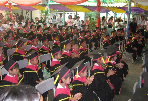 This morning it was Mai’s turn to graduate from kindergarten. Thai schools have graduations at kindergarten, 6th and 12th grades. This time there were no long speeches and no chanting. The kindergartners, 4th and 6th grade dancers performed.