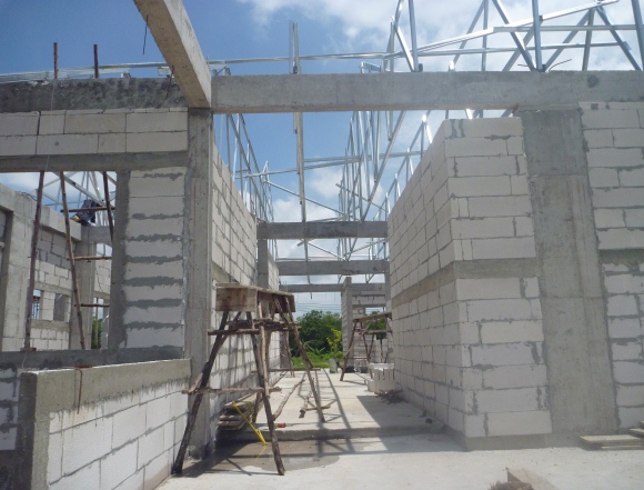 We are building two new houses, one on each side of our first. The one on the right (#2) is further along than #3, but we hope both are complete by November. One thing a little unusual for this area are the wide concrete posts at strategic locations. Their purpose is to prevent an earthquake side thrust along each of the concrete ceiling beams from collapsing the structure. Side thrusts across a beam are taken up by the beams that intersect them. These have their own wide posts attached. We don’t need quite the protection we would if there was a second concrete floor above, but there are the concrete beams and a tile roof.