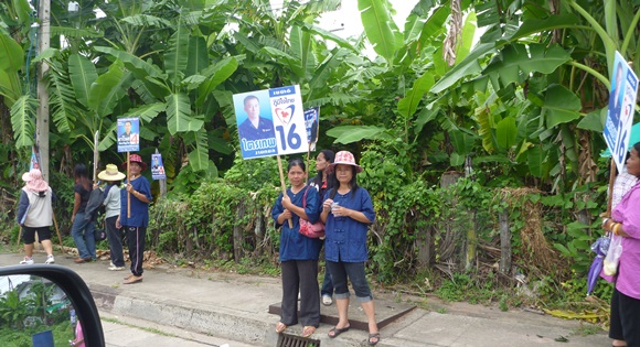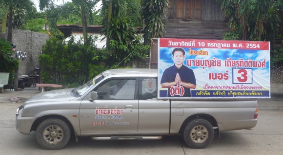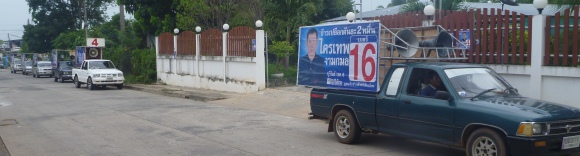 This leads me to the next traffic problem: elections. Fortunately they only have them every four years. For a town of this size there are an unbelievable number of speaker trucks driving around town very slowly while making the most noise possible. They start on my street at about 7:30 AM every morning. The worst offender is candidate #3 (out of about 16). The announcer, with great excitement, yells his name several times in a row and then goes on to tell of his greatness in such an excited tone that it quickly leads to emotional overload and exhaustion. He comes by a number of times each day. Multiply that by 16 or more candidates and you begin to understand. Each candidate may have many trucks. They are all over and moving slow. At one point I saw six of them in a row, for different candidates, all with speakers going full. Whether a Thai could understand any of that I don’t know. I surely could not.