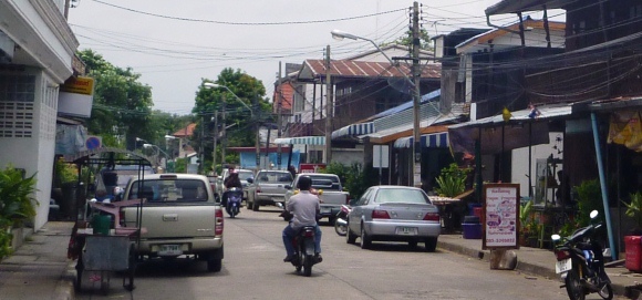 Not the most narrow street in Nang Rong, certainly not the busiest, just the street in front of my house. My driveway is on the right just past the green stripped awning. One way traffic works here. It is a two way street, for motorbikes anyway.