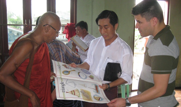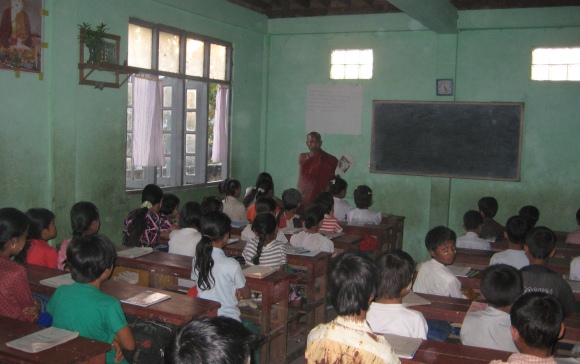 Many elementary classrooms in Myanmar are taught by monks. Sue and Gayle Holmes plan to update their teaching methods.