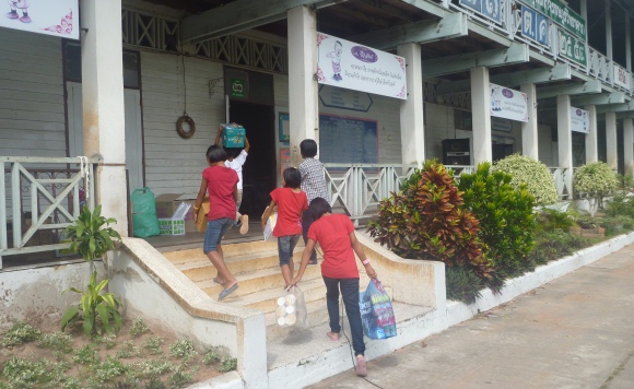 Five of our girls taking supplies into a classroom for temporary storage.