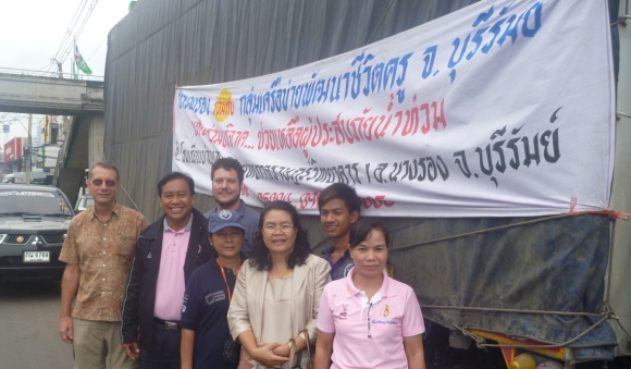 Our board member Tasanee Lapimai, a schoolteacher in Nang Rong, organized some area teachers to provide assistance for the flood victims. Our foundation participated in both donations and volunteering. With Nang Rong Community School as the drop off point supplies came in steadily for a few days, were stacked by volunteers, loaded into a large truck and taken south. My car and a pickup with additional supplies and some teenagers for unloading went along as well.