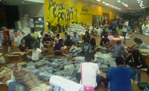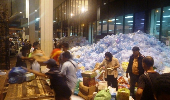 Don Muang was the international airport until replaced by Suvarnabhumi in 2007. It is still used for domestic flights and is a huge place. There were vast piles of bottled water and other supplies both outside and inside the terminal. School is out here now, so there were hordes of university students along with farang backpacker types throughout the terminal repackaging donated items into “care packages” which were loaded onto various military transports for delivery to the flood areas.